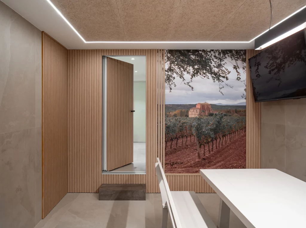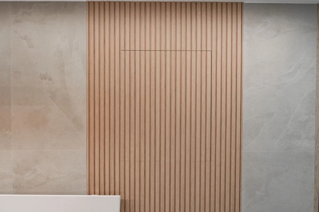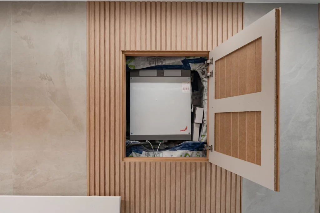 Se ha prestado especial atención a la integración estética: las puertas de acceso al baño y a las cajas de instalaciones se han enrasado con el forro de madera laminada de la pared, logrando una continuidad visual limpia y elegante.