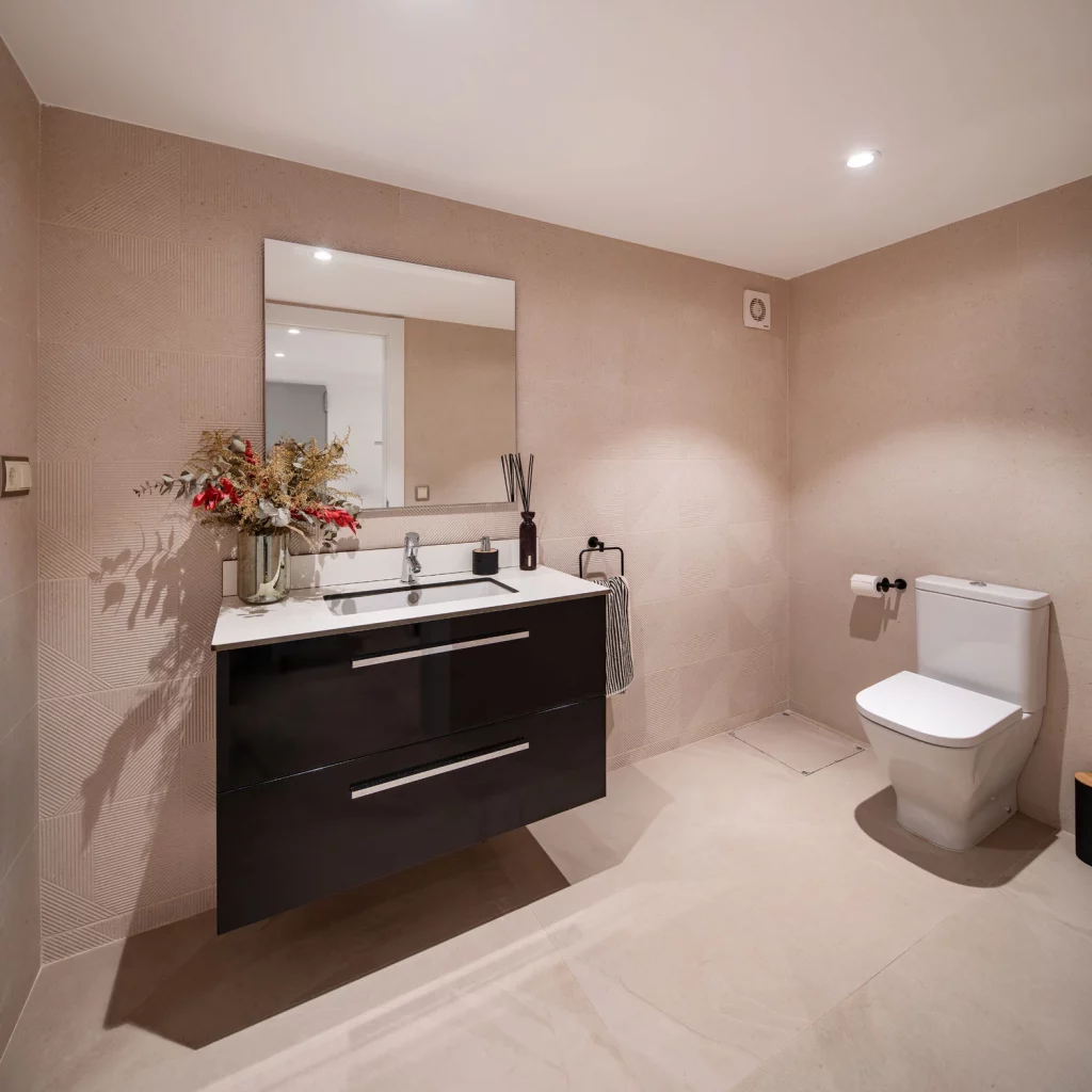 - Gres cerámico en suelos y paredes, resistente y de fácil mantenimiento, también certificado bajo criterios de sostenibilidad.
